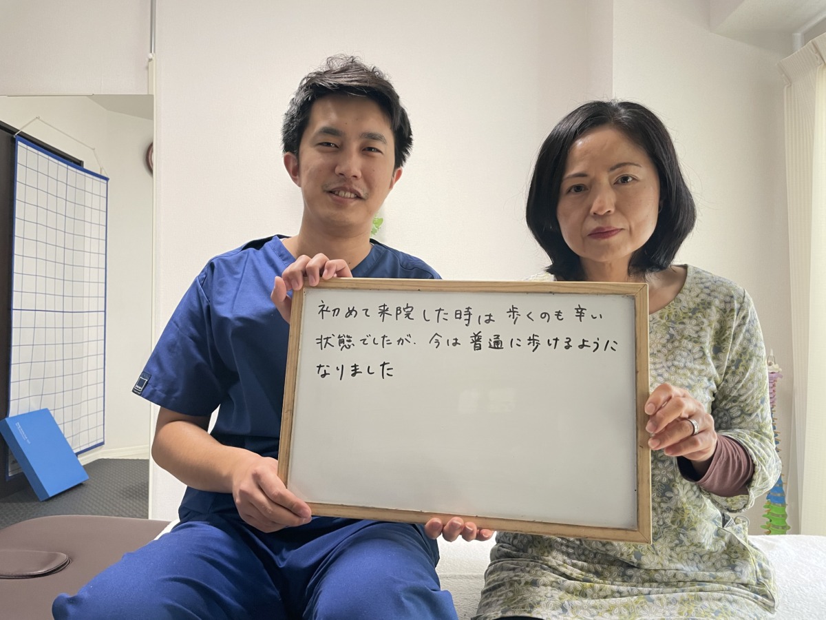 初回の施術で少し変化を実感していただき、回数を重ねるごとに少しずつ症状が軽減していき、結果的に今では長時間歩いても右足に痺れや痛みが出る事が無くなりました。
