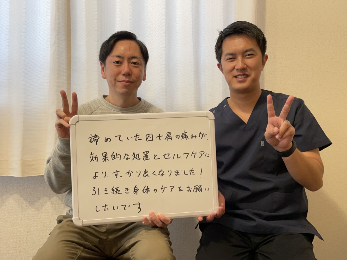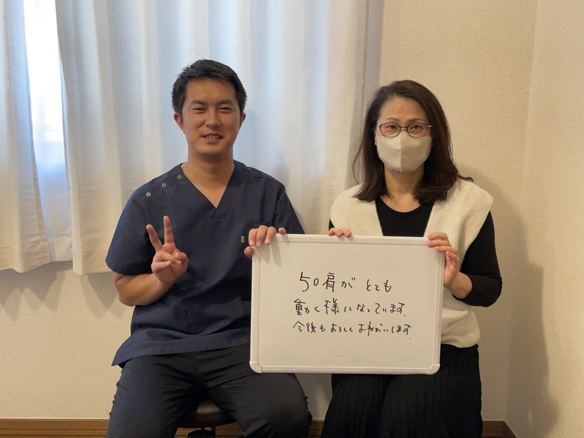 初回の施術で少し変化を実感していただき、少しずつですが痛みが軽減、可動域も増えていき、夜もしっかり寝れて日常生活にも支障が出ないぐらい改善しました。