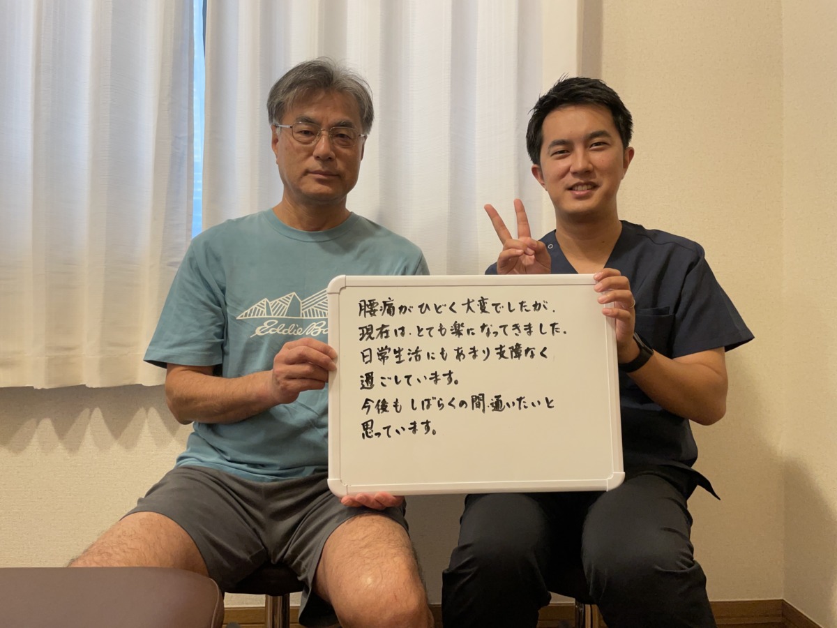 初回の施術で少し変化を実感していただき、数回の施術で痛みが軽減して、今では長時間椅子に座っても痛みが出ず、お仕事に全く支障が出ない状態になりました。