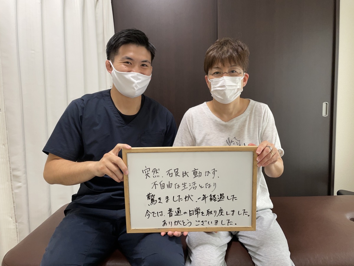 初回の施術で痺れ、痛みが軽減し、施術を重ねて行くうちに少しずつ軽減して、結果的に歩くのも日常生活でも全く気にならない程、改善しました。