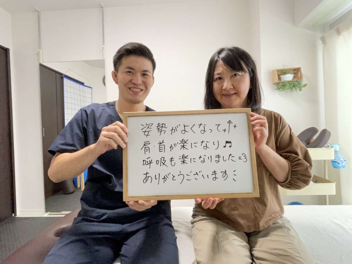 初回の施術で変化を実感していただき、少しずつ症状が軽減していき、今では首、肩こりが気にならなくなり、呼吸も楽にできるようになりました。