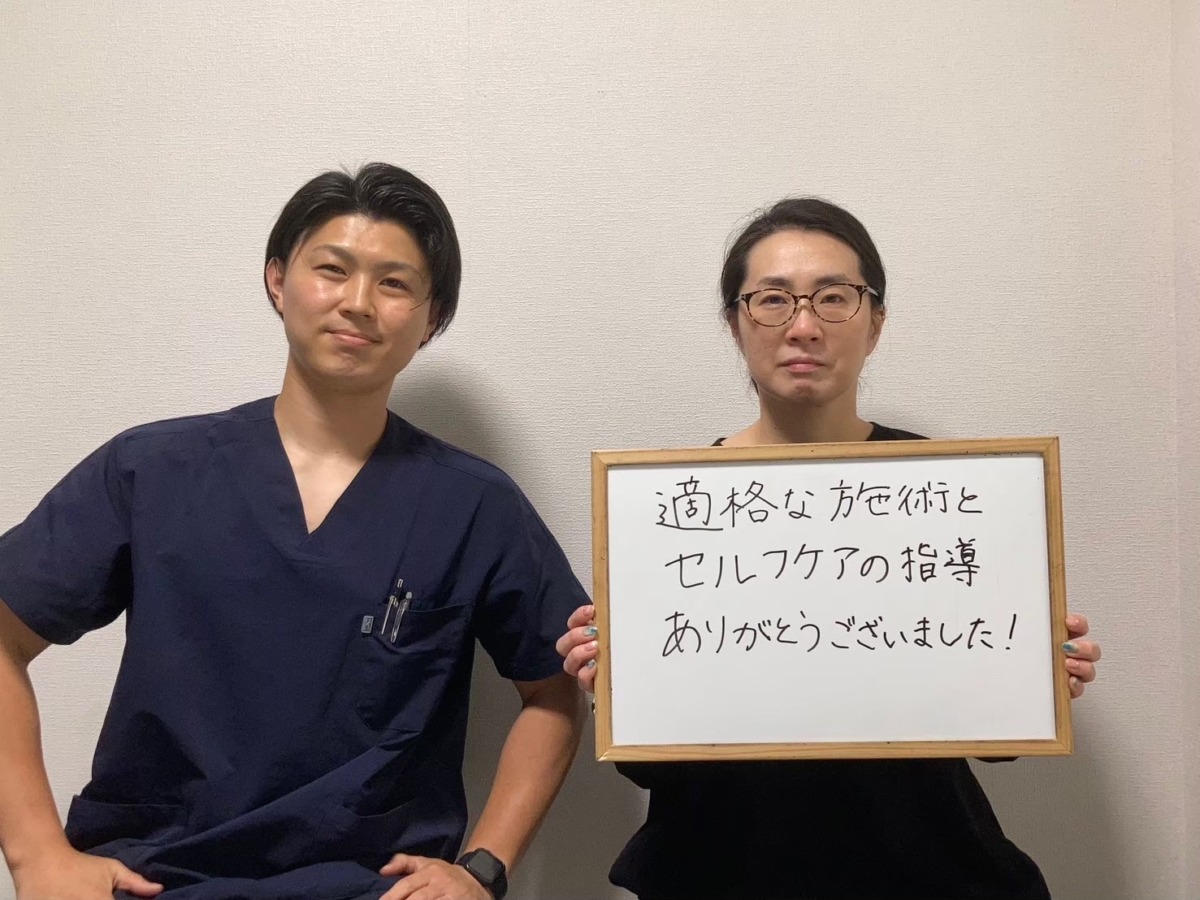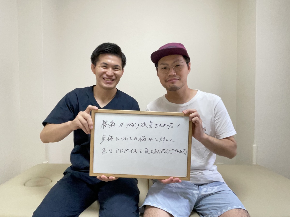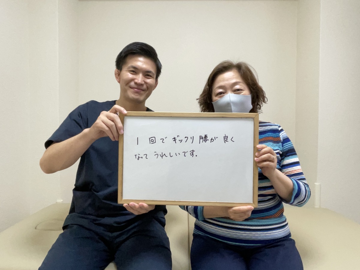 歩くのも、立ち上がるのも、しゃがむのも全ての動作に腰痛が強く出現していましたが、施術後はどの動作も痛みなくスムーズに動かせるようになり、1回の施術でかなり改善しました。